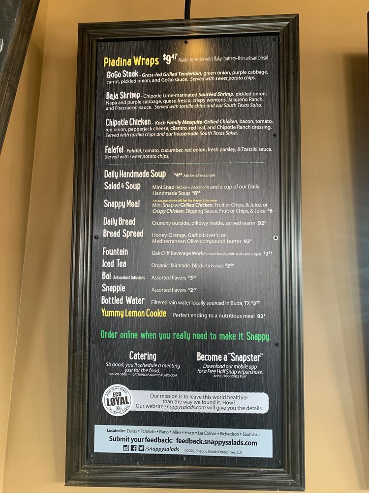 Whether you're in the mood for a refreshing salad, a satisfying wrap, or a delicious dessert, Snappy Salads has you covered. Located in Irving, TX, this women-owned eatery offers a wide range of options, including vegan choices and gluten-free selections. From the popular Bam Bam Spinach salad to the flavorful Korean BBQ Grain Bowl, there's something for everyone on the menu. The restaurant also provides various utilities like delivery and takeout, making it convenient for any occasion. With a focus on fresh ingredients and bold flavors, Snappy Salads is the perfect spot for a quick lunch or a relaxing dinner. Don't miss out on their seasonal Teriyaki Grain Bowls, which are sure to impress with their savory teriyaki grilled chicken or tenderloin options. Give your taste buds a treat at Snappy Salads today!